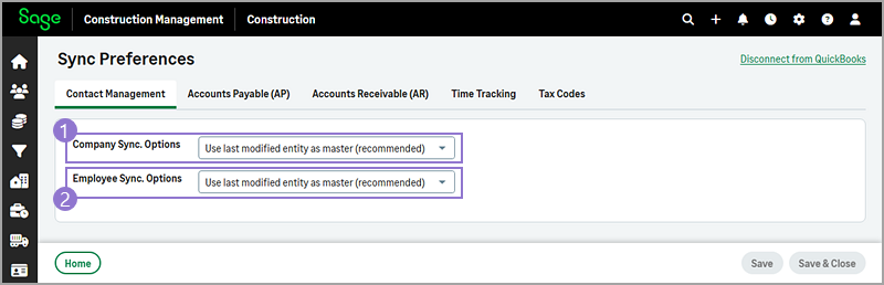 Options Description Use last modified entity as master (recommended) The company modified last in Sage Construction Management or QuickBooks Online will be the master record. Always use Sage CM to update QuickBooks Customer or vendor's address and phone information will be copied from Sage Construction Management to QuickBooks Online. Always use QuickBooks to update Sage CM Customer or vendor's address and phone information will be copied from QuickBooks Online to Sage Construction Management. -