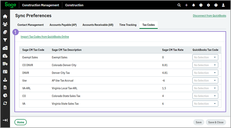 When exporting Sage Construction Management financial transactions, you must map Sage Construction Management tax codes to the corresponding QuickBooks tax codes. This mapping must be completed before running the Sync Wizard, and the tax codes must match between Sage Construction Management and QuickBooks Online.