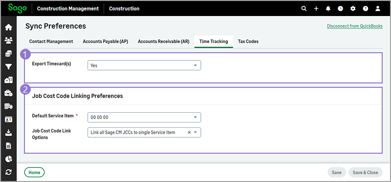 Options Description Link all Sage Construction Management JCCs to a single Service Item All Sage Construction Management timecards will reference the default service item above. Auto Link Service Item based on the Project Number (exact match only) If service items in QuickBooks Online reflect projects, then Sage Construction Management job cost codes can be linked automatically using the project number as the criteria. For example, if there are 20 projects in Sage Construction Management then there will be the same number of service items. The service item's name will be the project number not title. In cases where there's no match upon export, the default AP service item referenced above will be used.