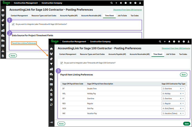 You can integrate labor timecards with Sage Construction Management. Sage Construction Management includes options for selecting the right data source for the project’s labor timecard fields.