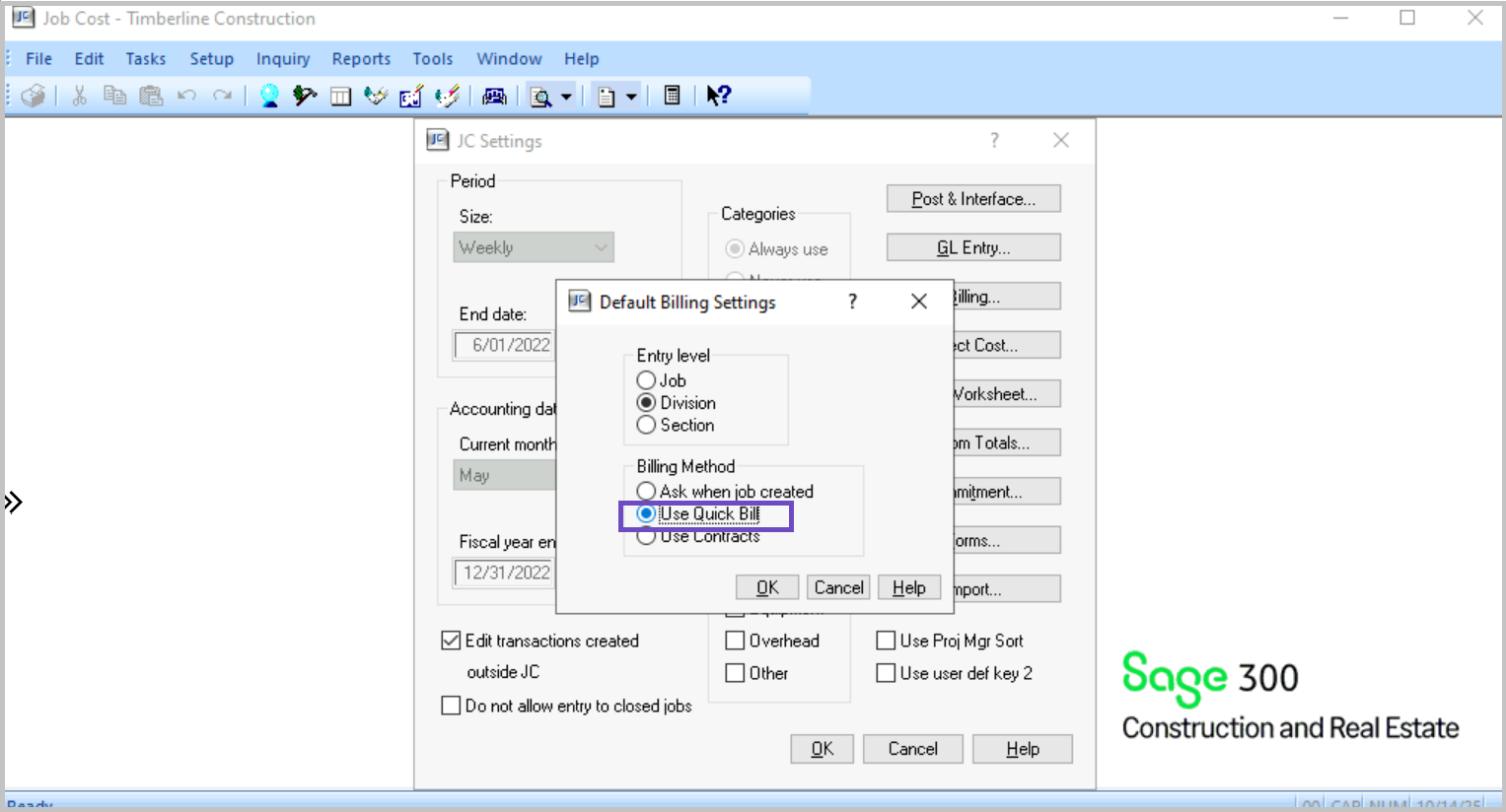 Set the default billing method to QuickBill in Sage 300 Construction and Real Estate