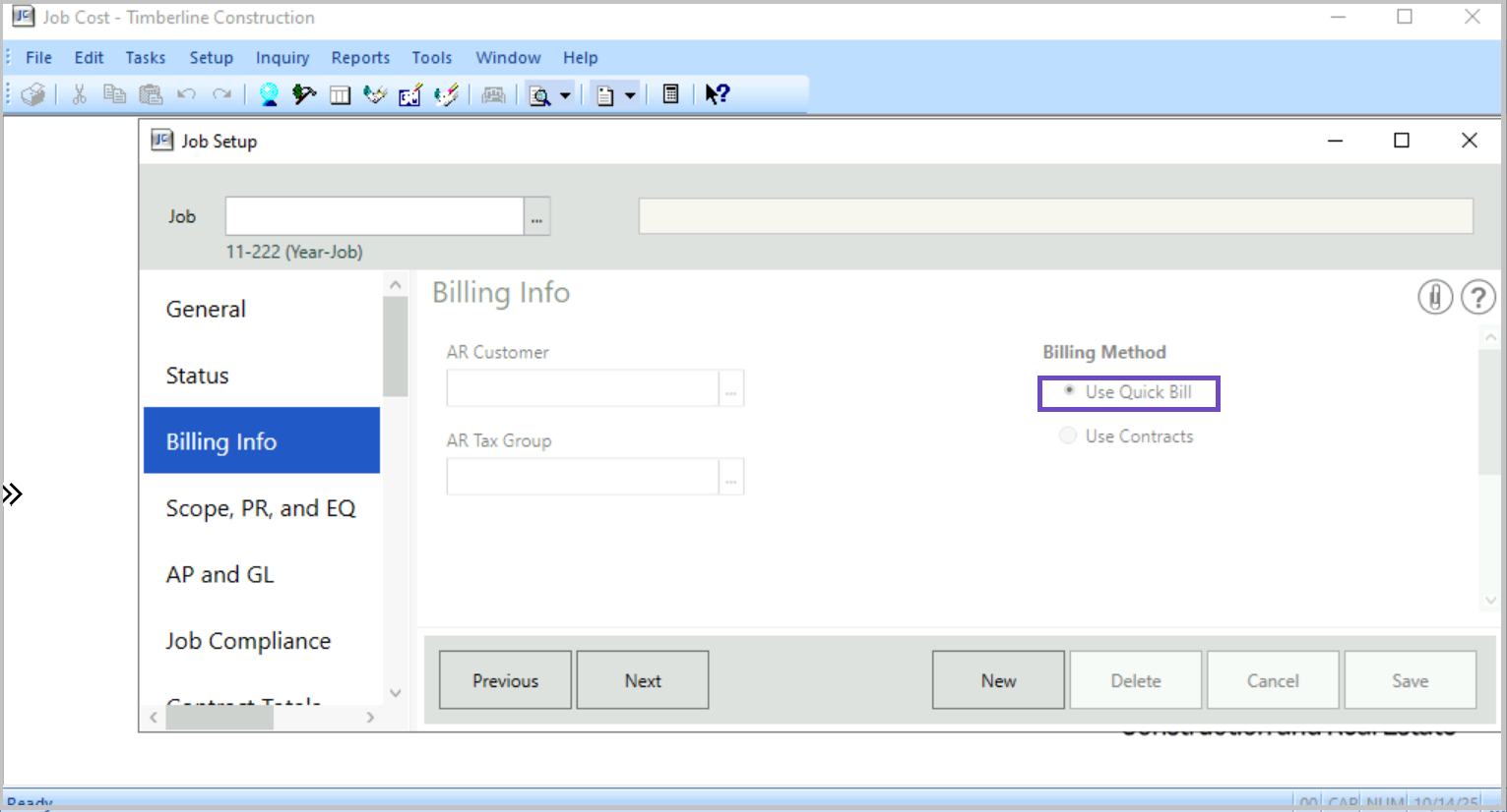 When creating a new job, verify that the billing method defaults to QuickBill. Select Setup > Jobs... > Billing Info. Make sure that the Use Quick Bill radio button is selected at the Billing Method section.