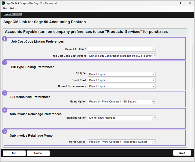 Auto Link AP Item based on the Project Number (exact match only) If service items in Sage 50 Canada reflect projects, then Sage Construction Management job cost codes can be linked automatically using the project number as the criteria. For example, if there are 20 projects in Sage Construction Management then there will be the same number of service items. The service item's name will be the project number not title. In cases where there's no match upon export, the default AP service item referenced above will be used.