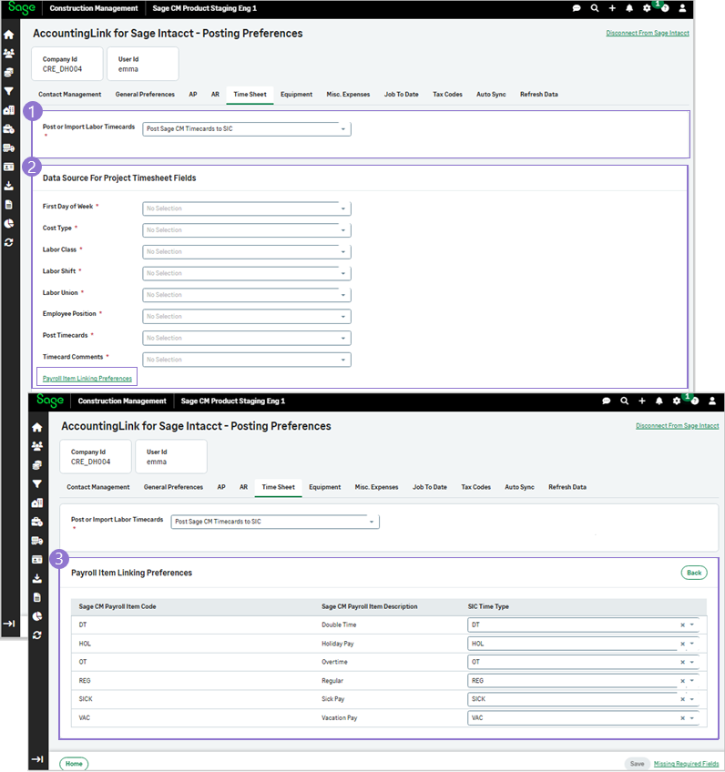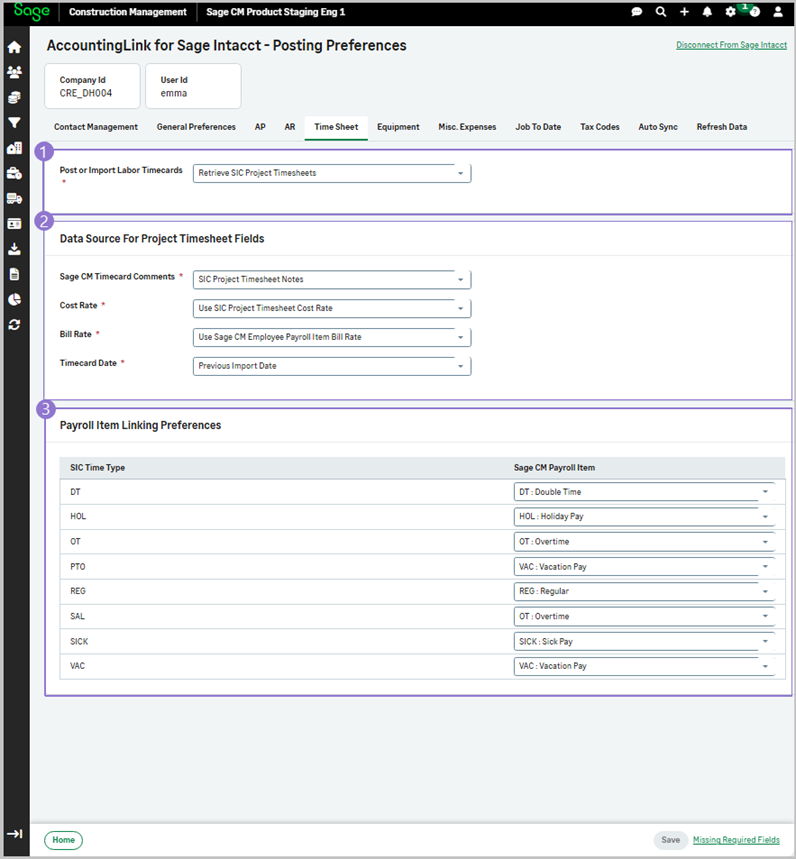 Post Sage Sage Construction Management Timecards to Sage Intacct