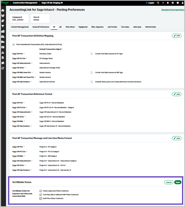 New properties for billable status are available in the Posting Preferences > AP tab to support this functionality.