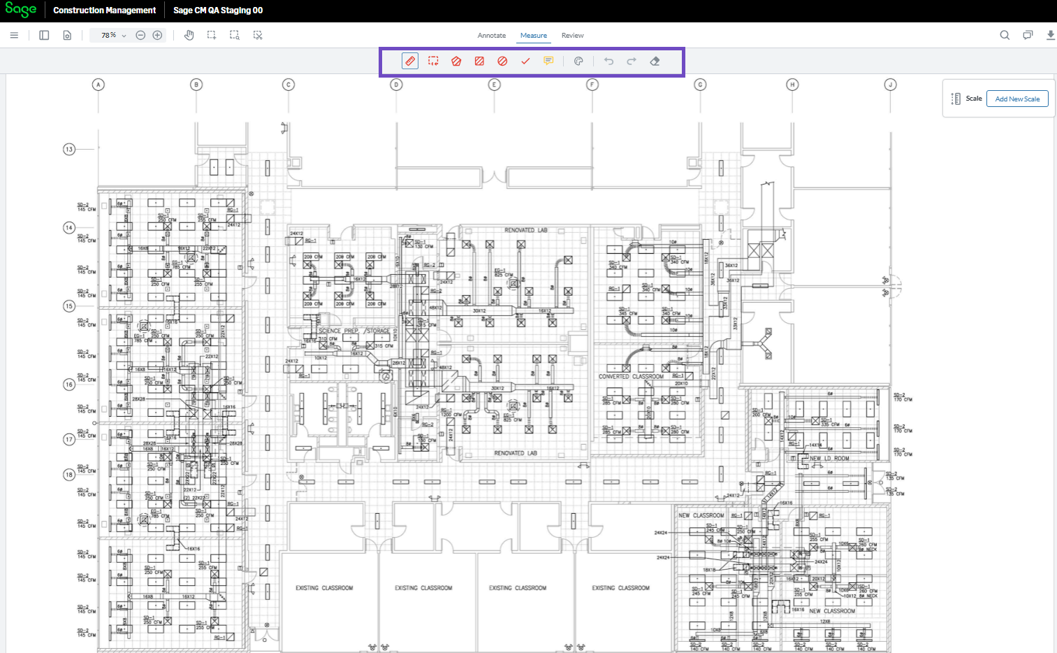 - Measure: The Measure tab includes tools for taking accurate measurements directly from drawings and plans. You can measure distance, area, perimeter, and other dimensions, helping you extract quantities and verify scale while reviewing construction documents.