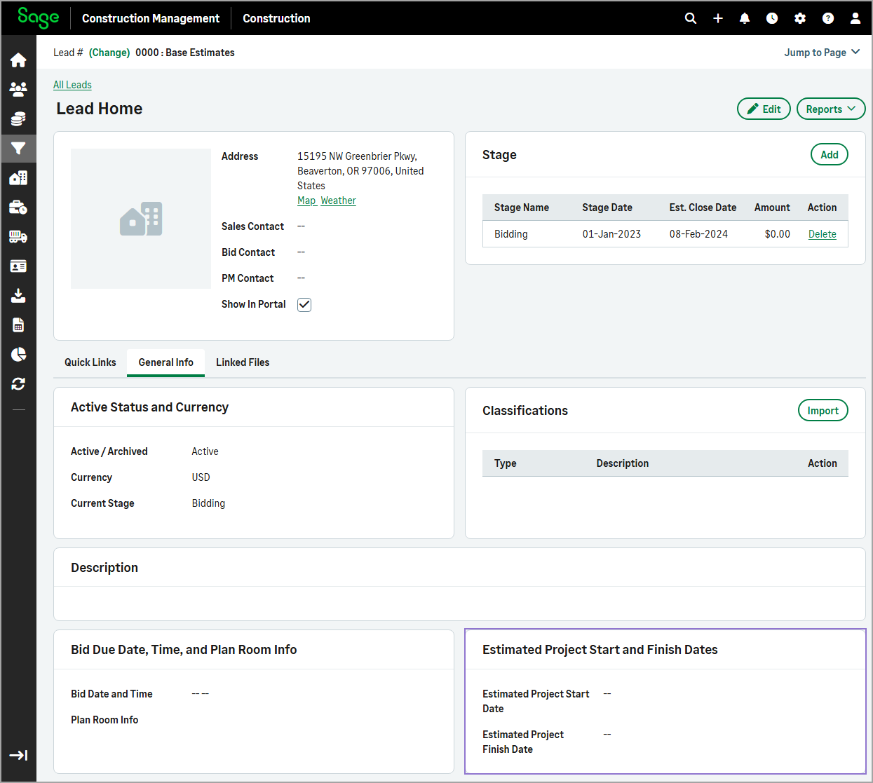In the General Info tab of leads, the Lead Start and Finish Dates section has been renamed to Estimated Project Start and Finish Dates.