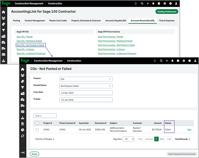 For example, in the Accounts Receivable (AR), select View COs - Not Posted or Failed in the Sage CM COs section.
