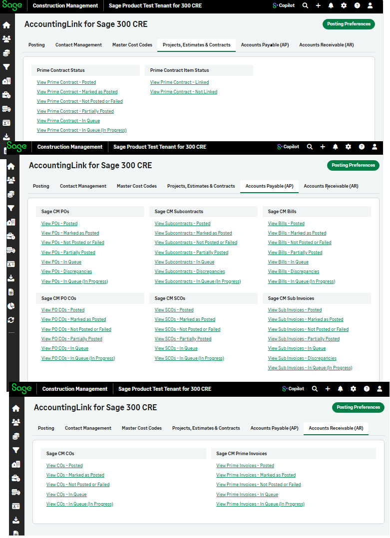 The Not Posted transactions for POs, PO COs, subcontracts, bills, SCOs, sub invoices, labor timecards, equipment timecards, and miscellaneous expenses have been updated to also include transactions of Failed status.