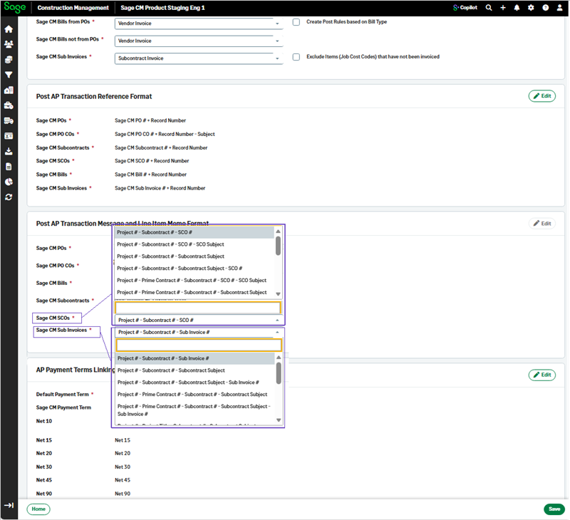 The AP Tab now supports additional memo‑format templates for SCO and subcontract postings. These new formats provide additional options for how SCO information appears in Sage Intacct. The addition of SCO, Sub Invoice, and Prime Contract formatting options are included .