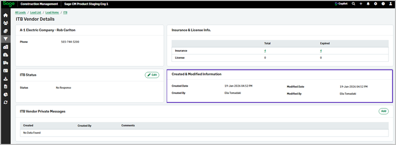The created and modified information of a vendor now display in the vendor details form in an invitation to bid.