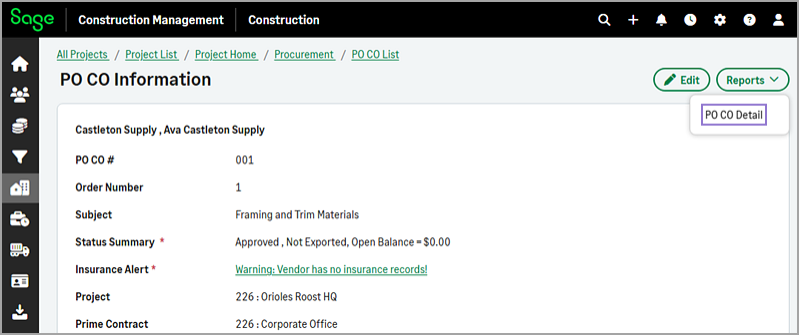 To download or share a report for a PO CO, use the new Reports > PO CO Details option available on the PO CO Information page.