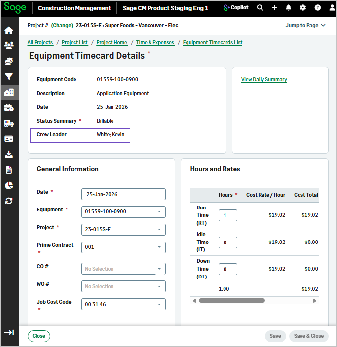 You can now view the Crew Leader name on the labor timecard. You can also select to view a column with the crew leader names in the labor and equipment timecard pages. The crew leader names are linked to the crew timecard pages, improving visibility and filtering capabilities. You can also select to view a summary of all details of a crew timecard.