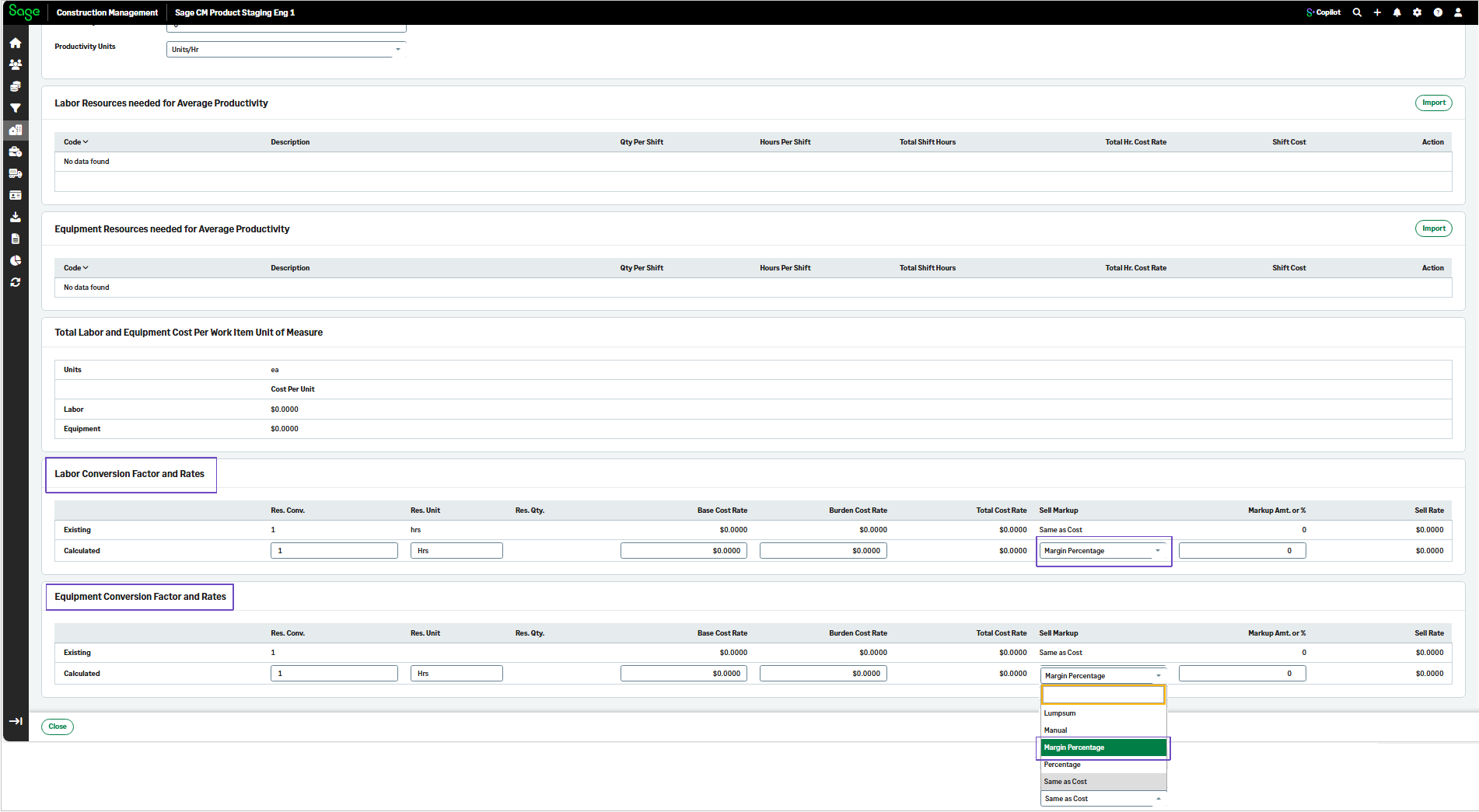 In the Labor Conversion Factor and Rates section, select Margin Percentage from the Sell Markup dropdown.