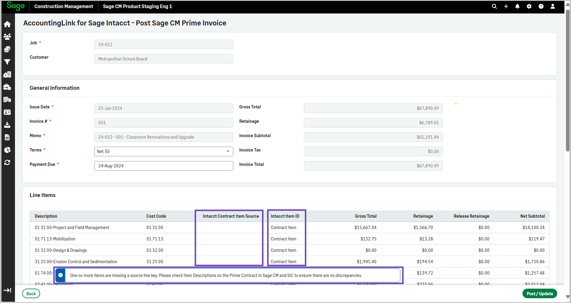 The source number of the Sage Intacct contract item now displays when posting prime invoices in a new column. In case the source line key is missing for one or more items in the prime invoice, a message displays prompting to check for inconsistencies between the two systems. In addition, the column Item ID has been renamed to Intacct Item ID.