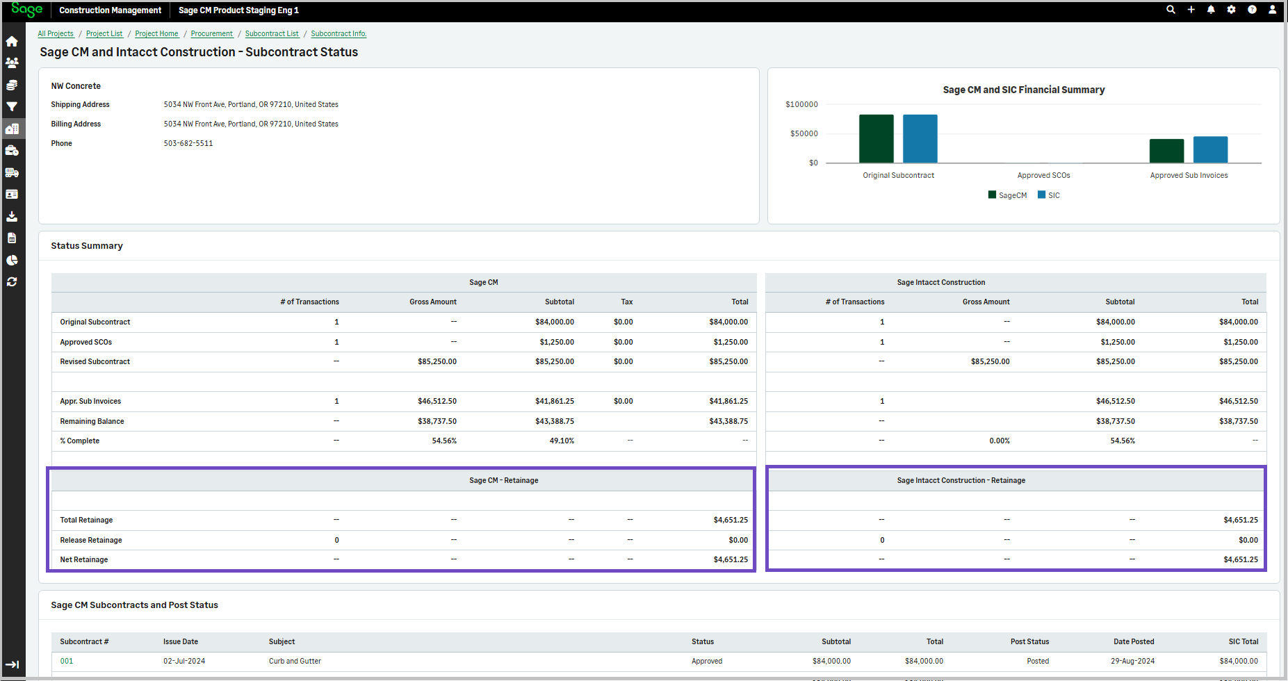 The retainage for Sage Construction Management and the retainage for Sage Intacct have been added in the subcontract status summary section.