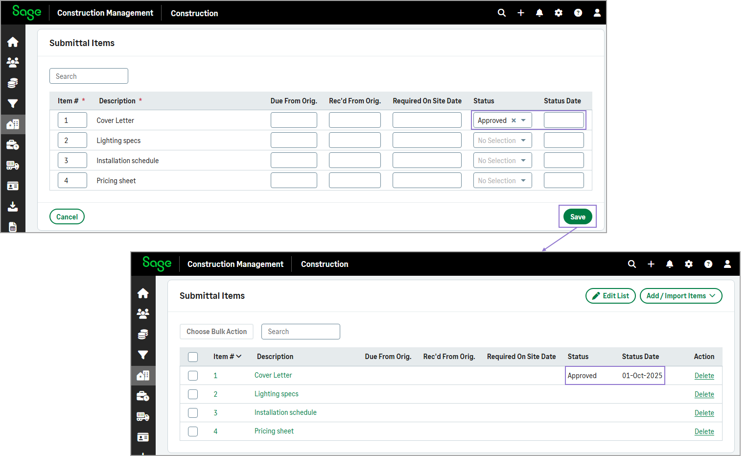 • When you update a submittal item's status without setting the status date, Sage Construction Management automatically adds the date that the status was updated.