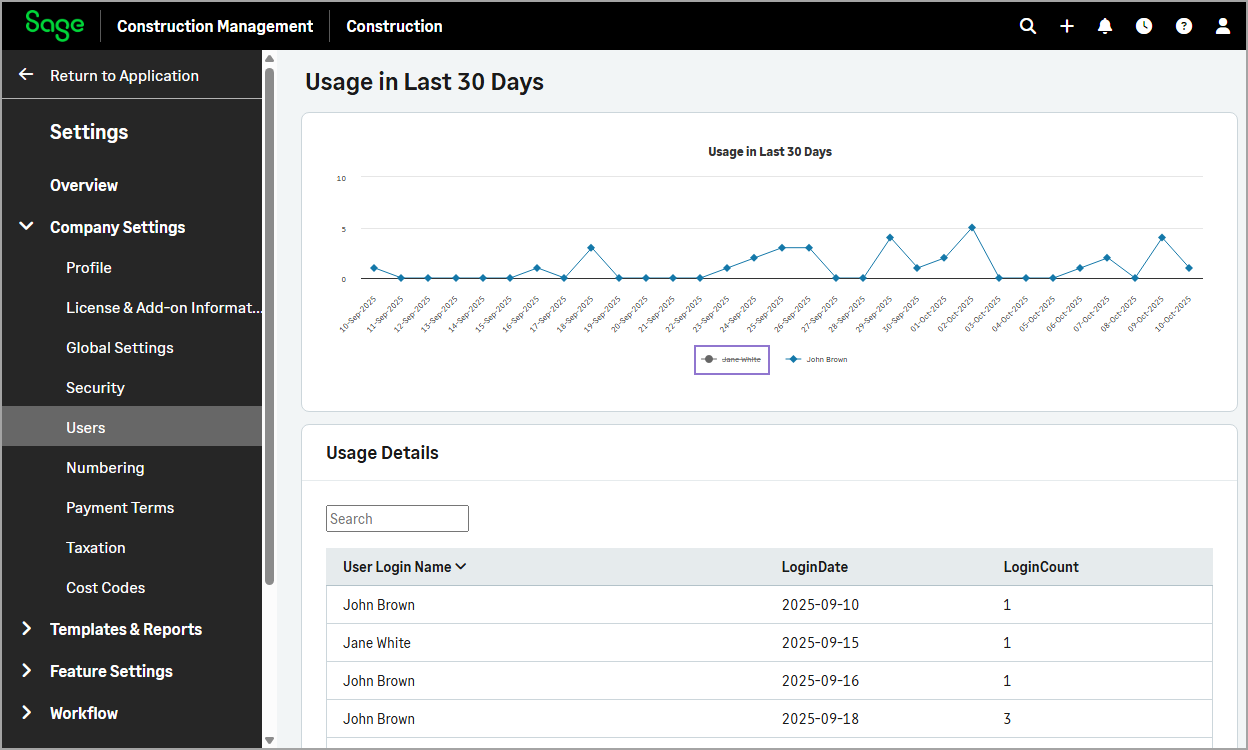 We've introduced a new usage data page in Settings to give you better visibility into user activity in Sage Construction Management over the last 30 days. This enhancement helps you to understand quickly login patterns and track user engagement.