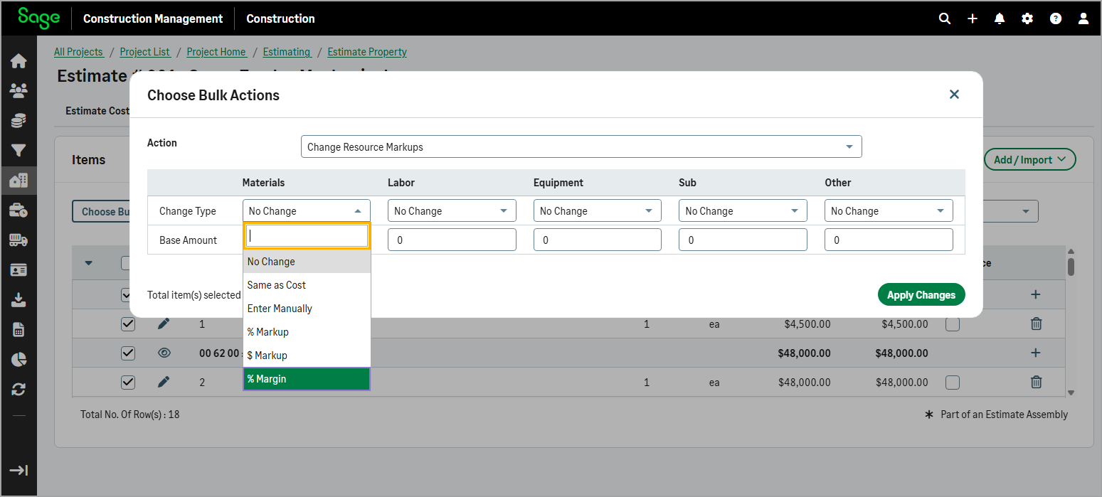 In the Items tab of an estimate, the option is available in the bulk actions dialog when you select to change resource markups.