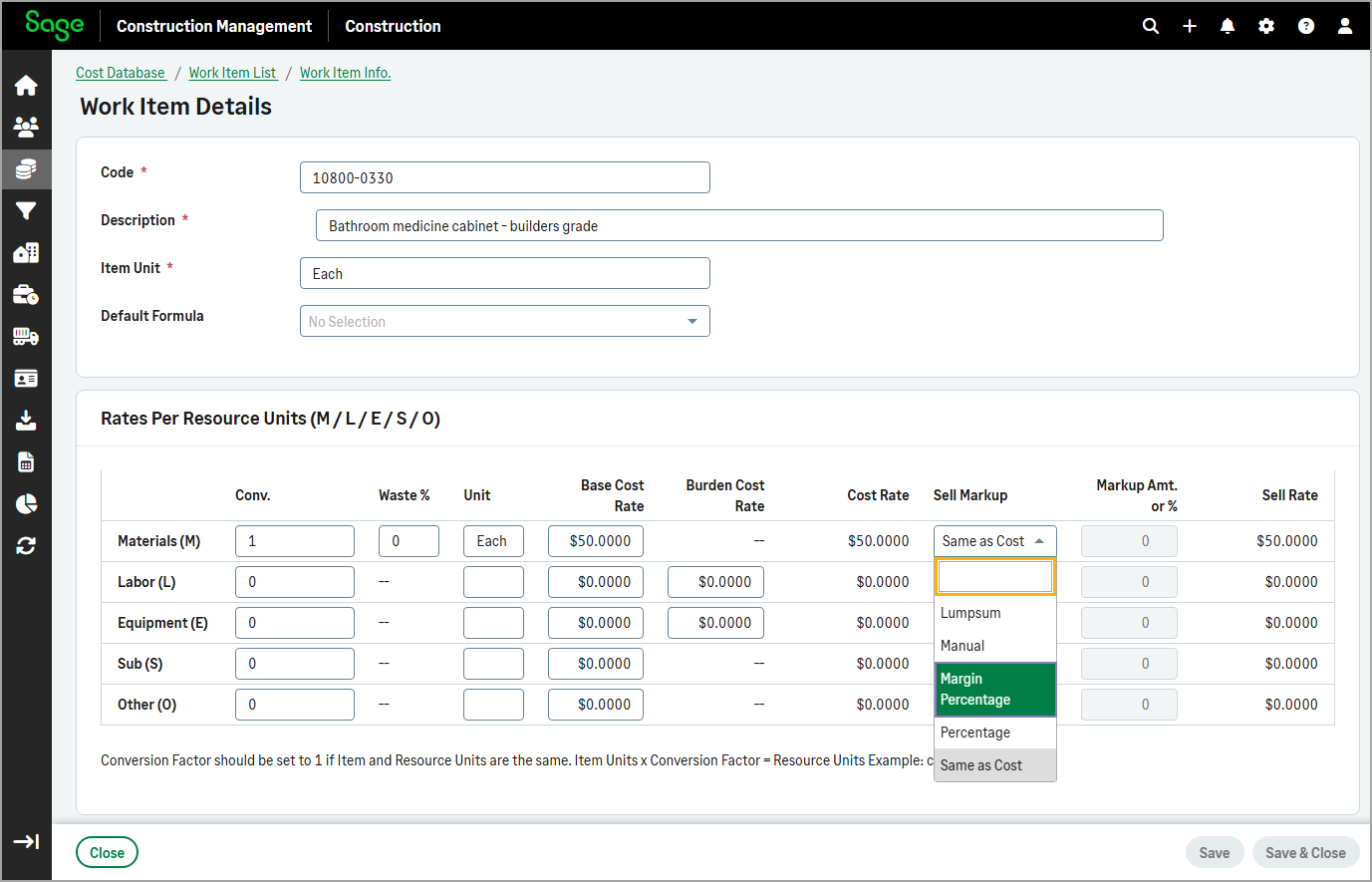 The Margin Percentage option allows you to define a desired profit margin instead of applying a markup on cost. Sage Construction Management will automatically calculate the sell price to ensure the specified margin is achieved. The sell rate is calculated as follows: