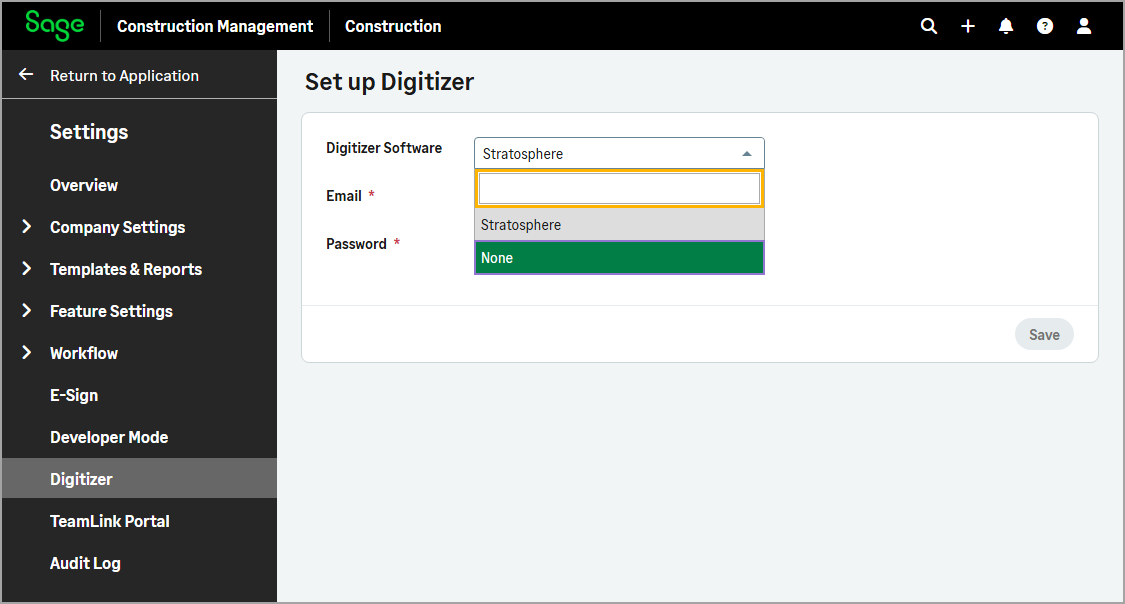 Log in to Sage Construction Management as an Admin and go to Settings > Digitizer.